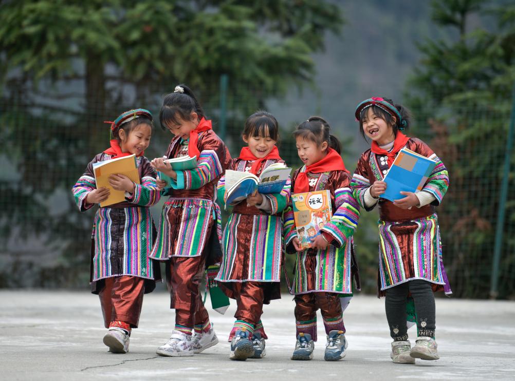 2023年2月16日,在贵州省从江县西山镇中寨教学点,领到新书的瑶族学生在一起交流。新华社记者杨文斌摄
